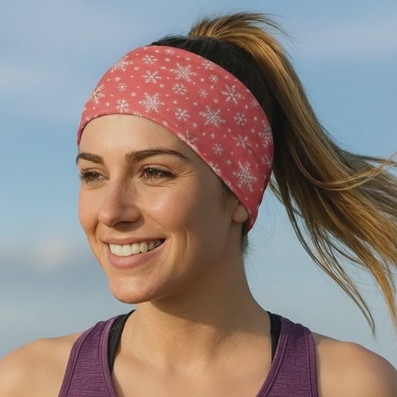 Our versatile designer soft, seamless, stretchy, Red Snow Flakes Christmas Polyester microfibre multi use tubular Bandana, Headband can be worn in many different ways, and for many different activities – see diagram for a few ideas.
